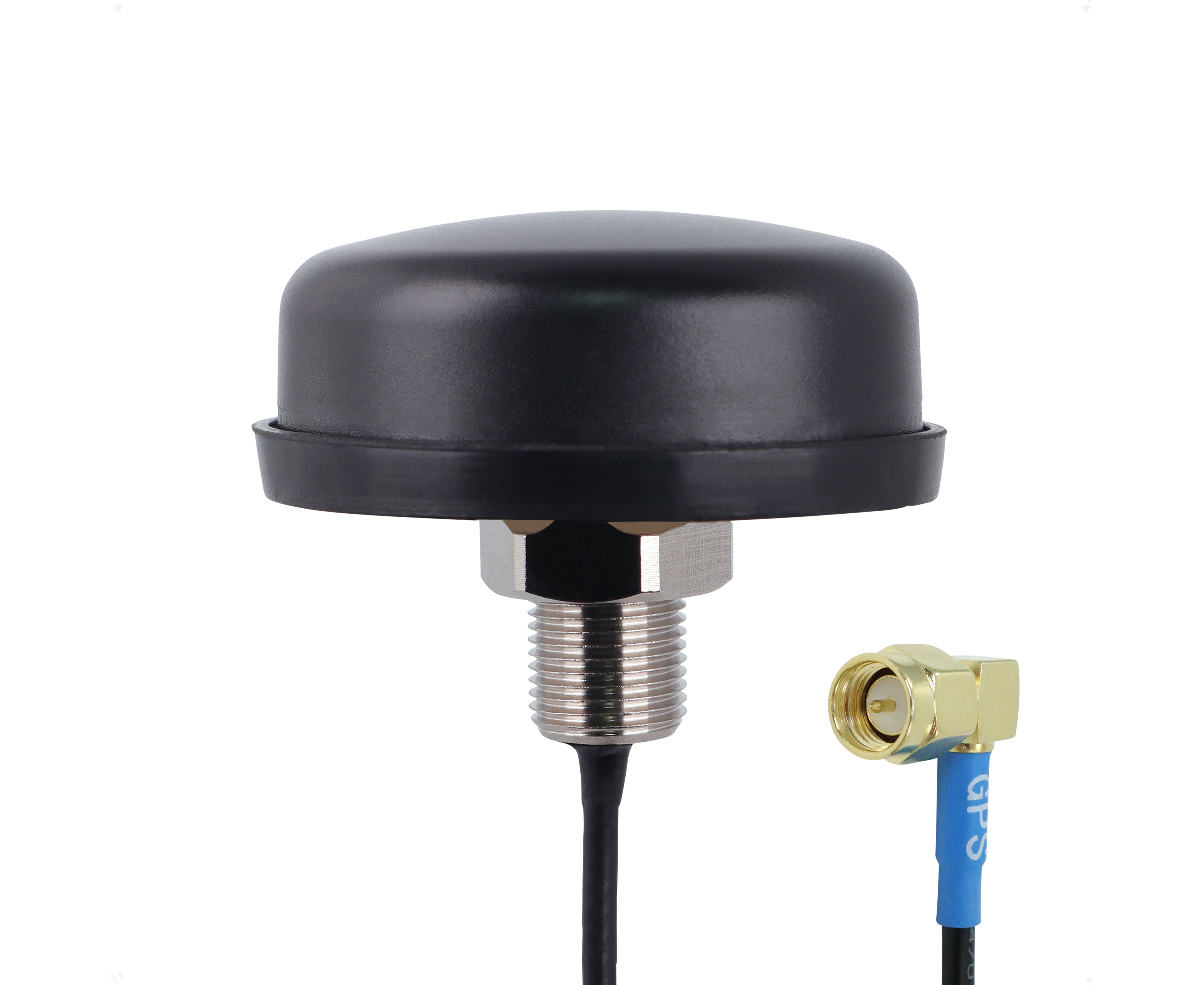The antenna permanently mounts via a 1/2 in (12 mm) hole with internal nut. Low-loss RG174 coax is fed through center mounting post and pre-terminated with an SMA Male connector. A rubber boot creates a water-tight seal. The antenna is not removable from outside and there is no exposed coax cable once installed.