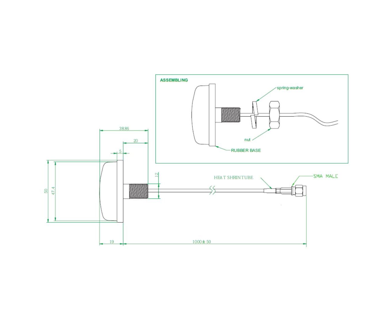 The antenna permanently mounts via a 1/2 in (12 mm) hole with internal nut. Low-loss RG174 coax is fed through center mounting post and pre-terminated with an SMA Male connector. A rubber boot creates a water-tight seal. The antenna is not removable from outside and there is no exposed coax cable once installed.