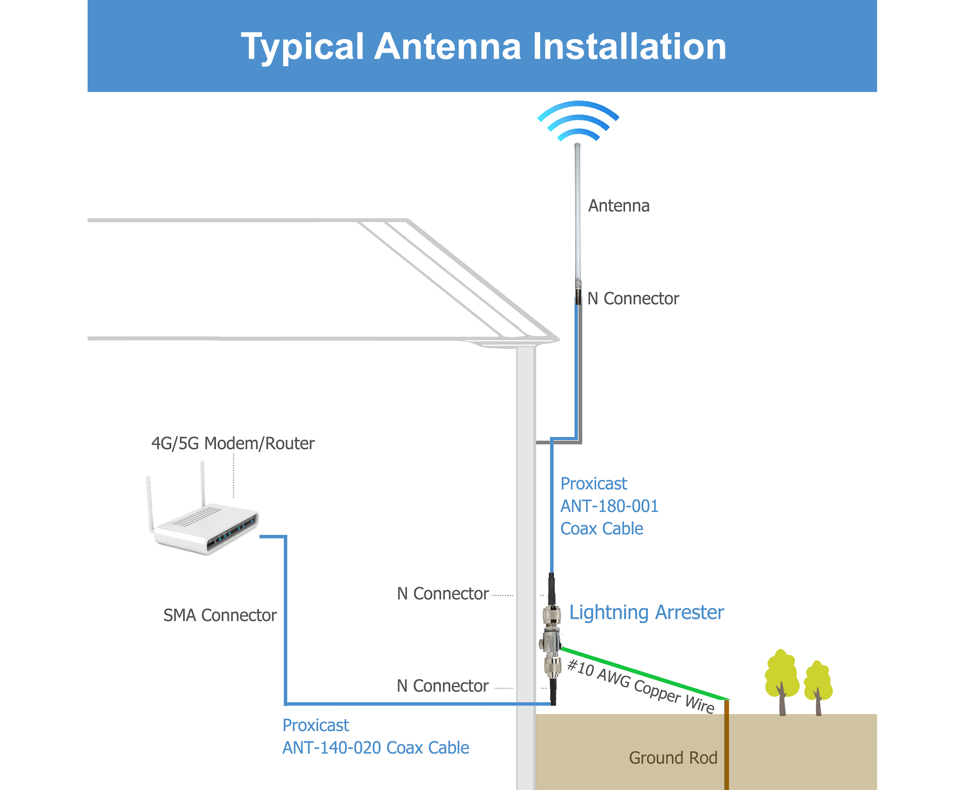 Note: All outdoor coax connections must be weather-proofed to minimize damage caused by moisture in the connectors or cabling. Use our Self-Bonding silicone tape (ANT-900-002) for fast and easy connection sealing.