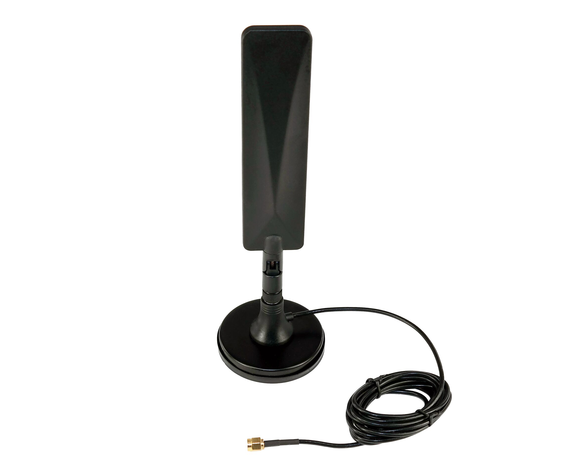 The polycarbonate antenna swivels 90 degrees and rotates 360 degrees for optimal positioning and maximum signal reception and has an integrated SMA male plug connector and ground-plane. This antenna is a smart choice for mobile or stationary applications where extra gain is required.