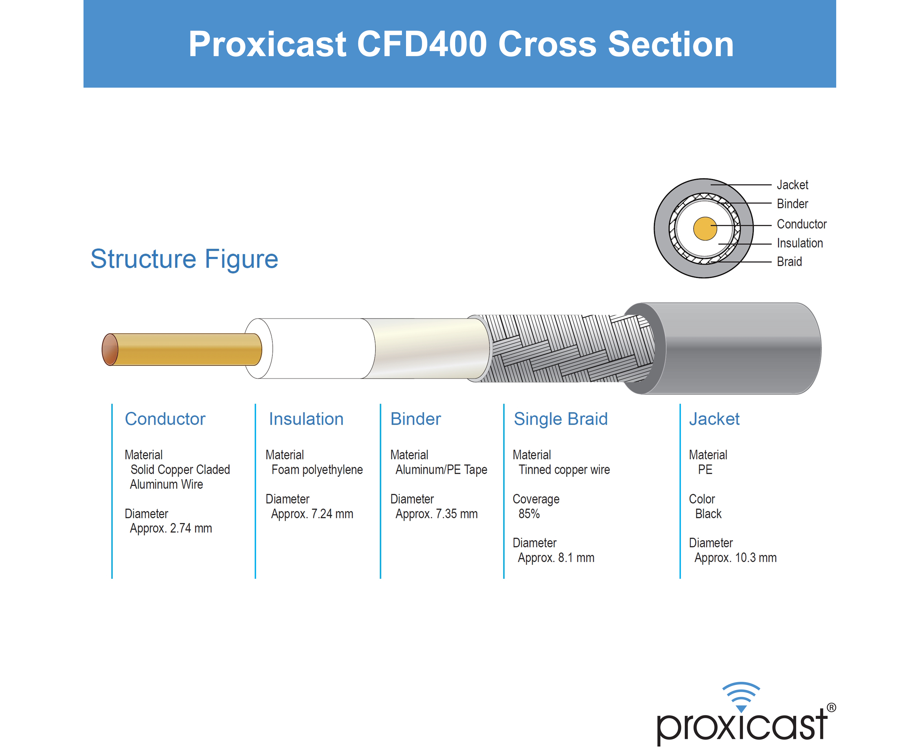 Proxicast's coax extension cable assemblies are constructed with top quality extremely low-loss cable and gold plated connectors. Each cable assembly is fully tested when manufactured. Proxicast recommends CFD195 coax for assemblies up to 10 ft, CFD240 for lengths up to 25 ft and CFD400 for lengths up to 75 ft. Coax runs over 50 ft typically require in-line amplification.