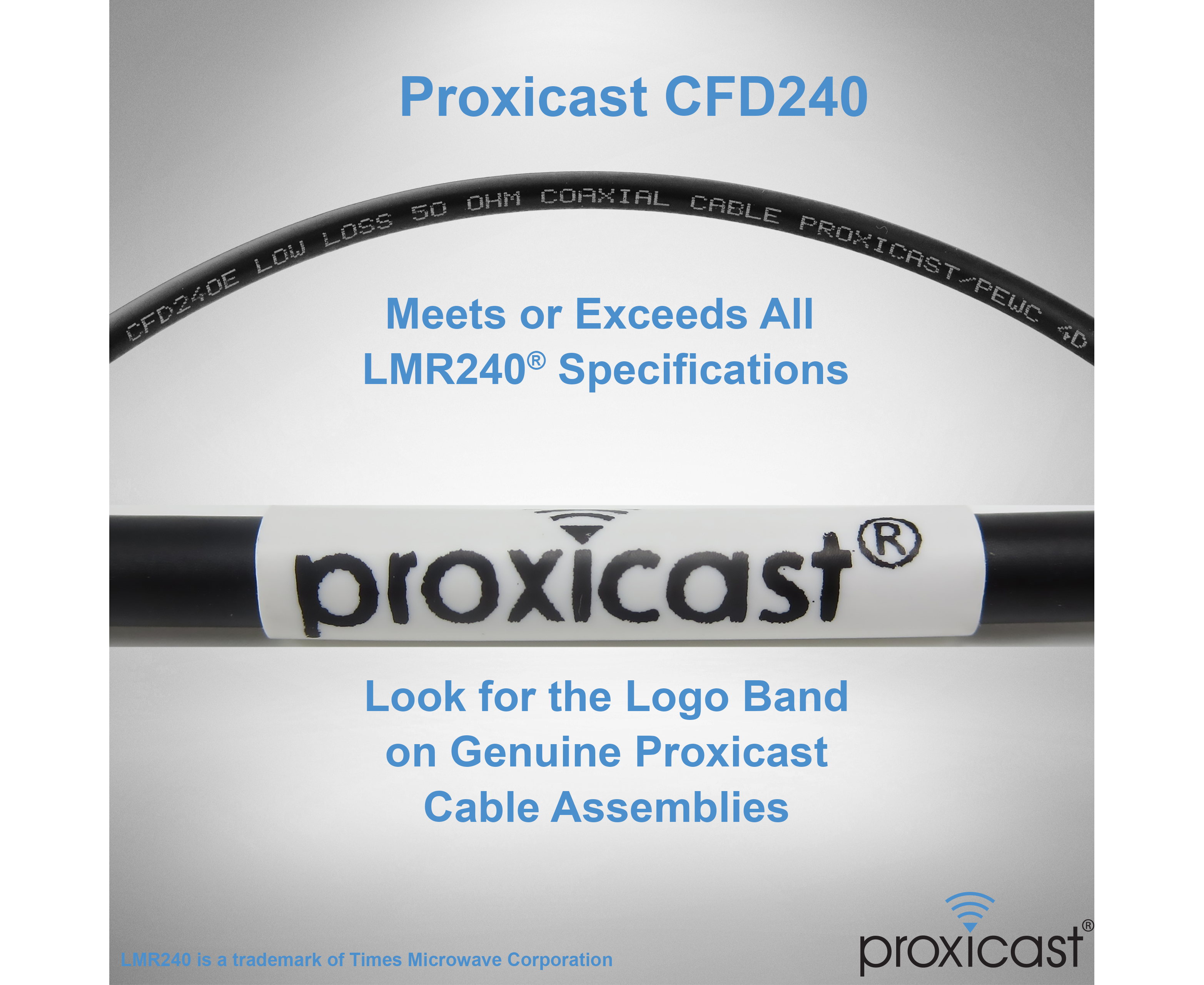 Proxicast's coax extension cable assemblies are constructed with top quality extremely low-loss cable and gold plated connectors. Each cable assembly is fully tested when manufactured. Proxicast recommends CFD195 coax for assemblies up to 10 ft, CFD240 for lengths up to 25 ft and CFD400 for lengths up to 75 ft. Coax runs over 50 ft typically require in-line amplification.